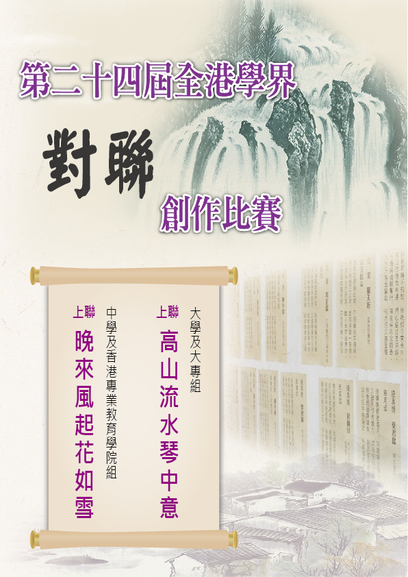 第二十三屆全港學界對聯創作比賽得獎作品(2019) 對聯作品By AclDesign2019 年 2 月 17 日大學及大專組上聯 『滿地落花紅不掃』 冠軍 陳柔李 香港中文大學 『長堤芳草翠初生』 亞軍 鄭海影 香港中文大…