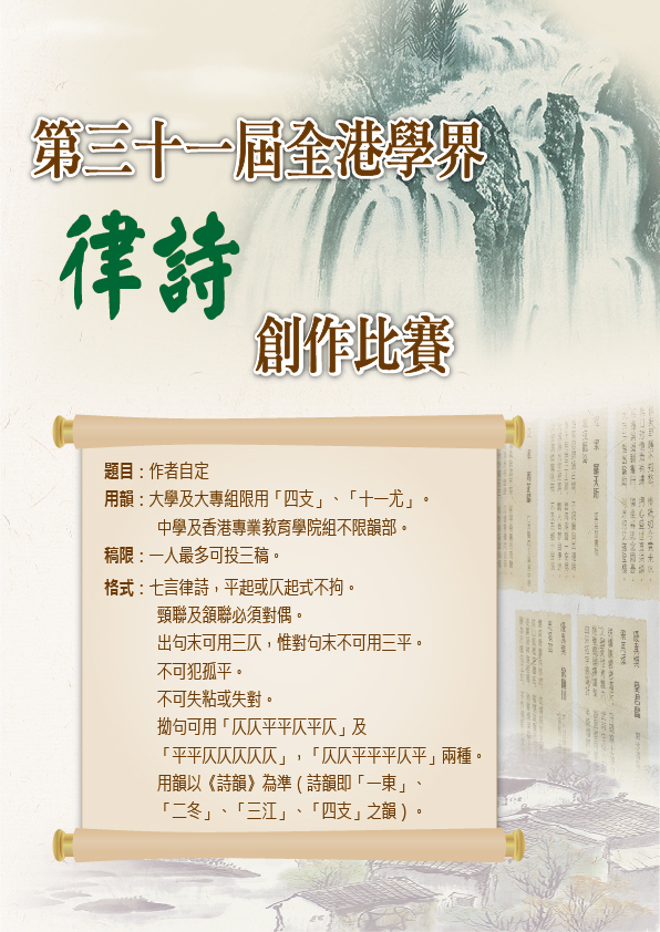 第三十一屆全港學界律詩創作比賽得獎作品(2020) 詩作品By AclDesign2020 年 1 月 8 日大學及大專組冠軍-劉浚㮾 香港中文大學 學書 手把長流墨灌之,凝嚴天地氣能持。 畫符妄說惟心造,汲古修途不我欺…